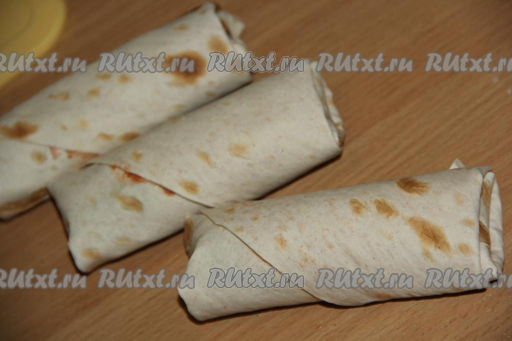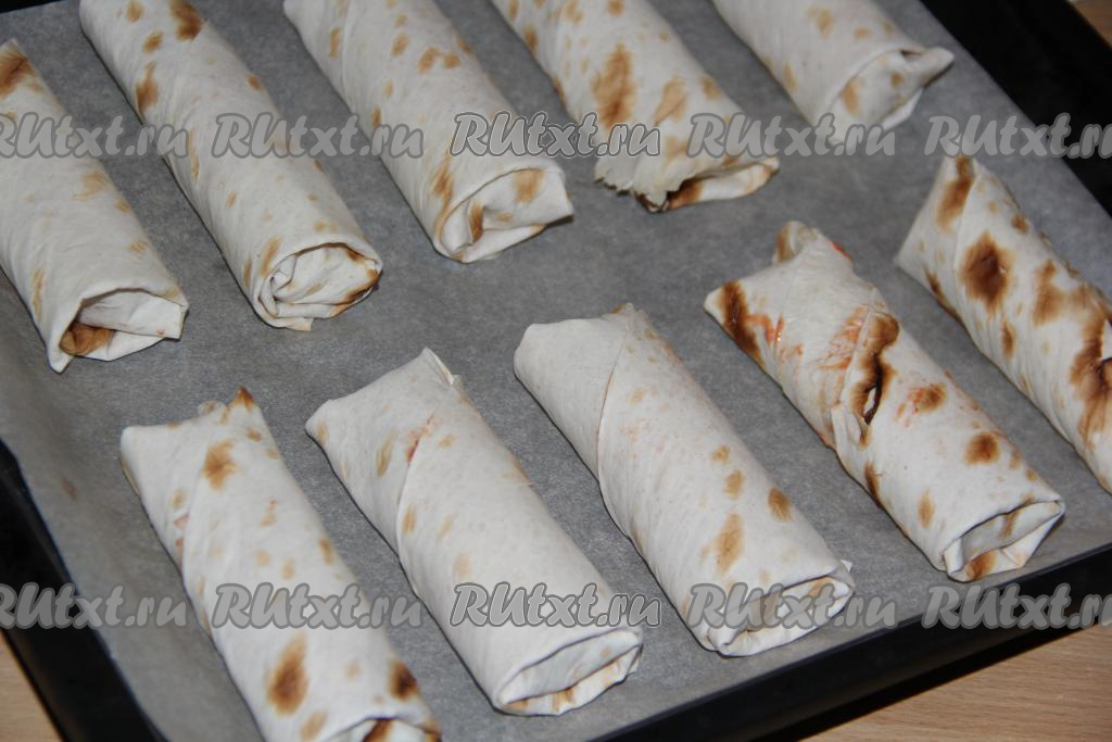 Лаваш разрезать на 10 квадратов. Соединить кетчуп и майонез, перемешать. Каждый квадрат из лаваша смазать соусом из кетчупа и майонеза, оставляя края квадратов чистыми.