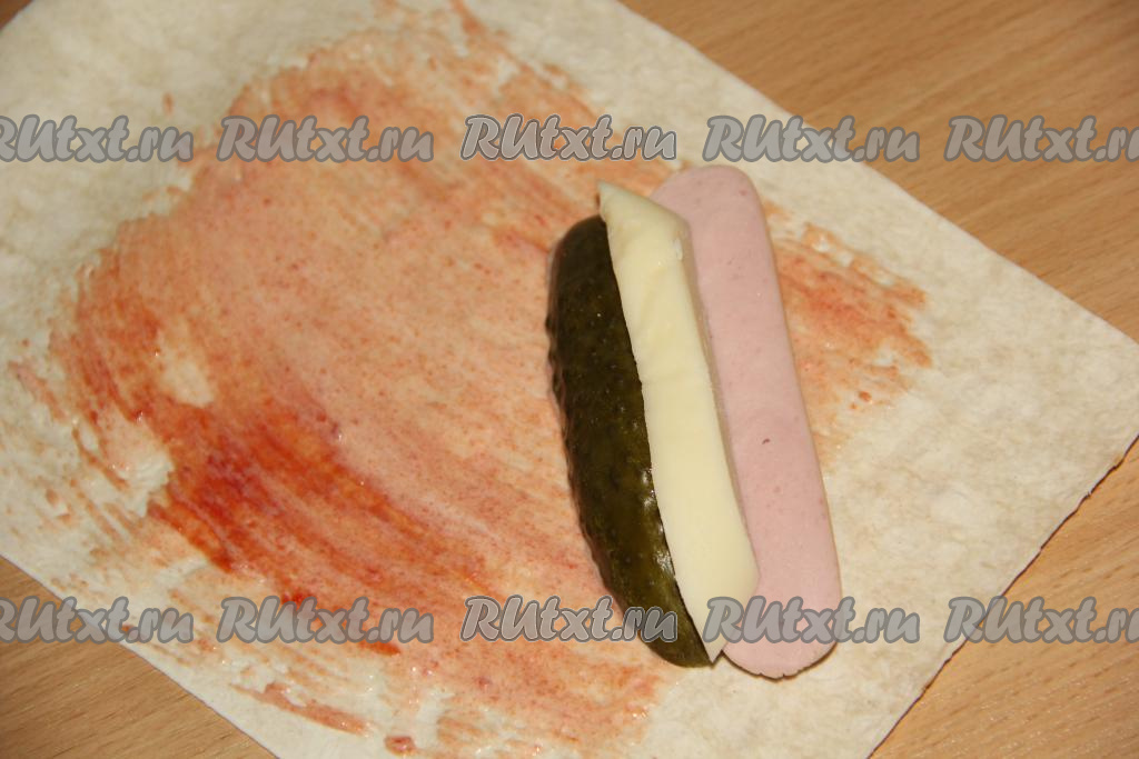 На уголок лаваша выложить брусочки сыра и огурца, половинку сосиски.