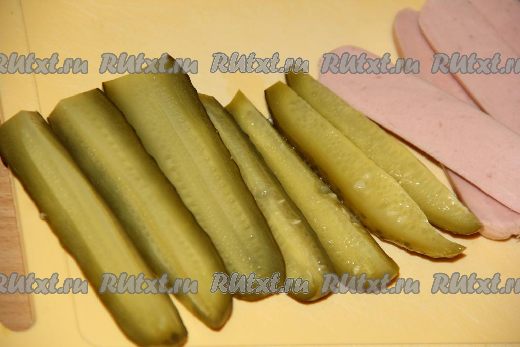 Огурчики нарезать на брусочки. Лучше брать огурчики такой же длины, как и длина сосисок.