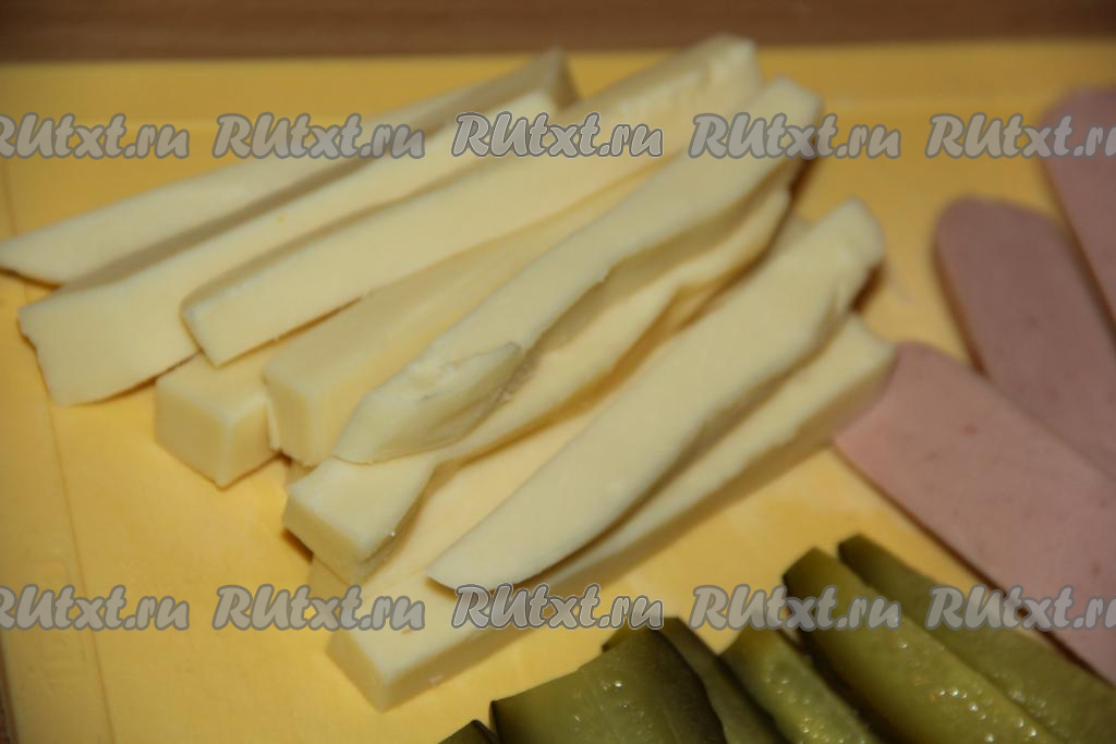 Сыр нарезать на брусочки такой же длины, как нарезаны сосиски и огурцы.