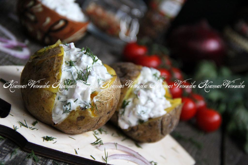 Запечь картофель в духовке очень просто. Главное - приготовить вкусную начинку для подачи картошечки. Я предлагаю нафаршировать запечённую картошку соусом из слабосолёной селёдки, солёного огурчика, лука и сметаны. Блюдо получается очень вкусным, да и выглядит симпатично. Всем советую попробовать сочетание запечённой картошки и соуса из селёдки!