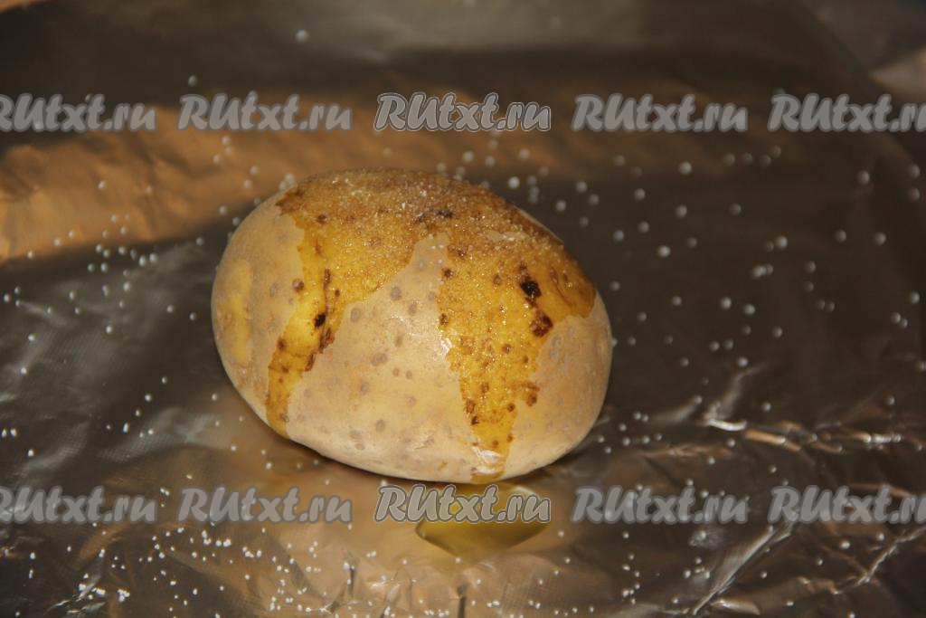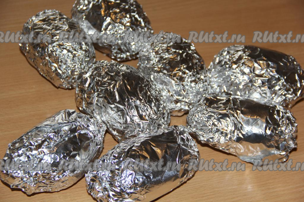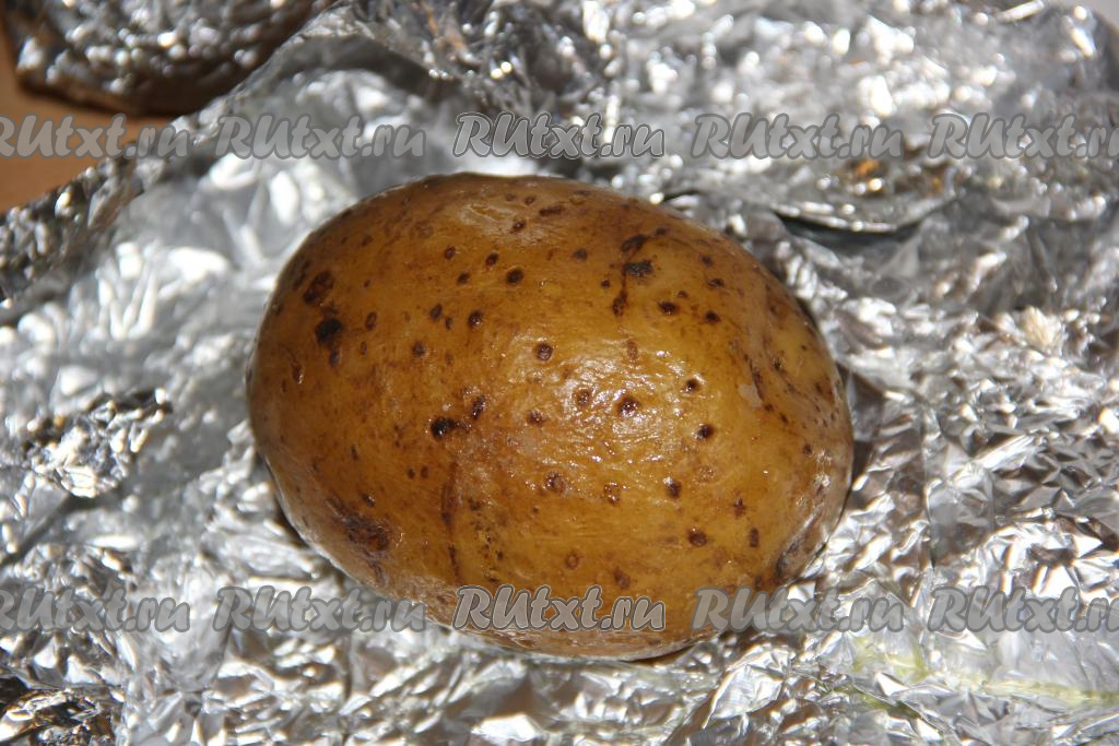 Плотно завернуть каждую картофелину в фольгу, выложить на противень и запекать в разогретой духовке, примерно, 45-55 минут при температуре 250 градусов. Время запекания зависит от размера картофеля (готовность можно проверить с помощью зубочистки - готовая картофелина будет легко прокалываться).