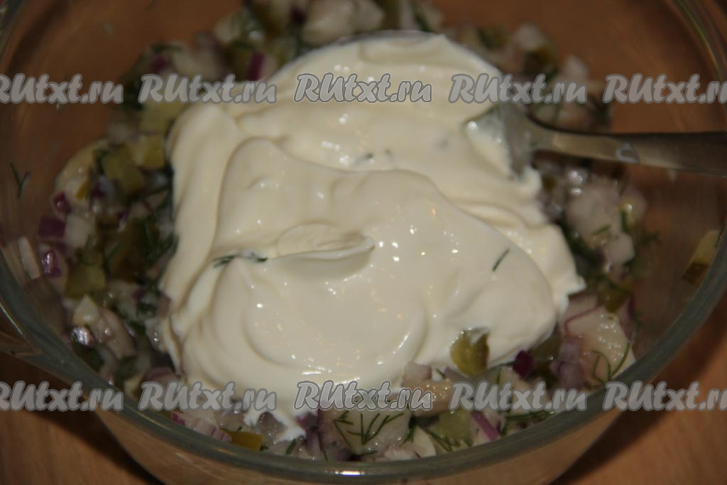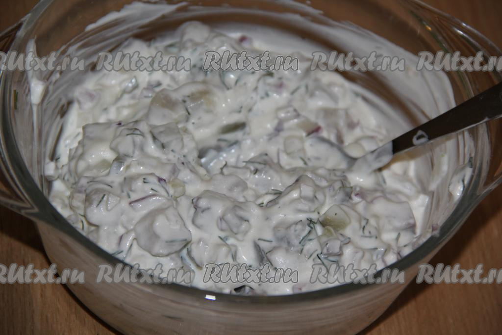 Тщательно перемешать соус из селёдки, огурцов и лук. Соль я не добавляла. Соус, приготовленный для запечённой картошки, получится в меру густым.
