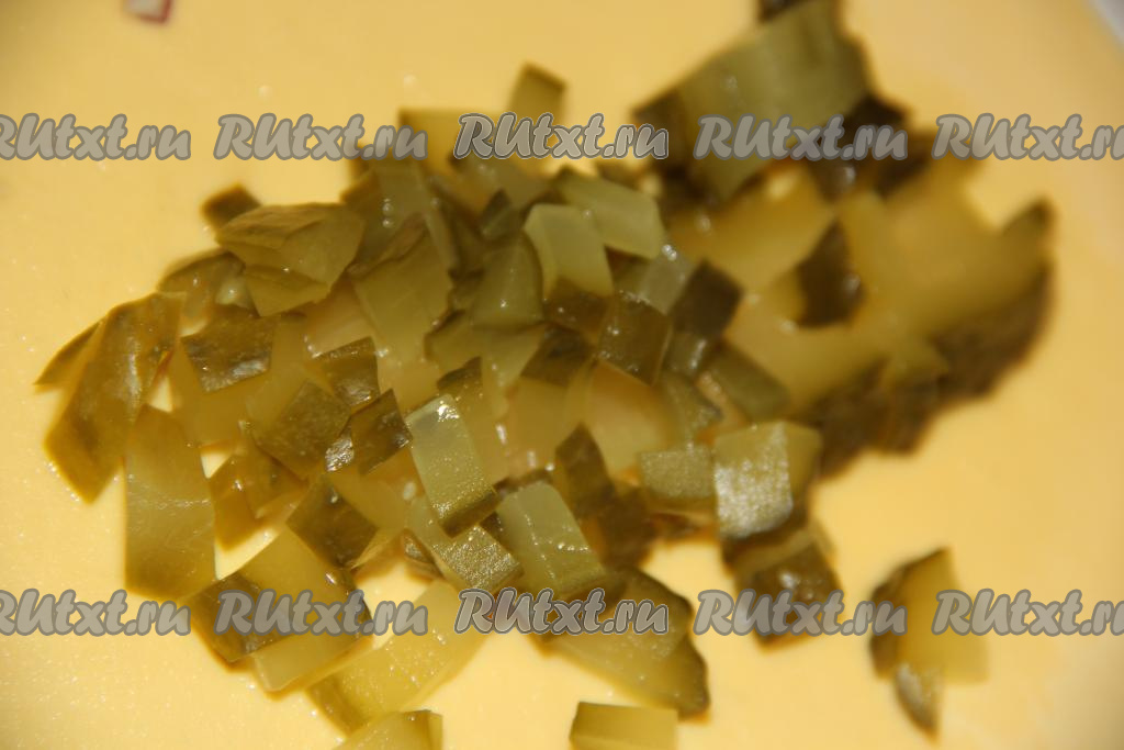 Маринованные огурцы нарезать на мелкие кубики.