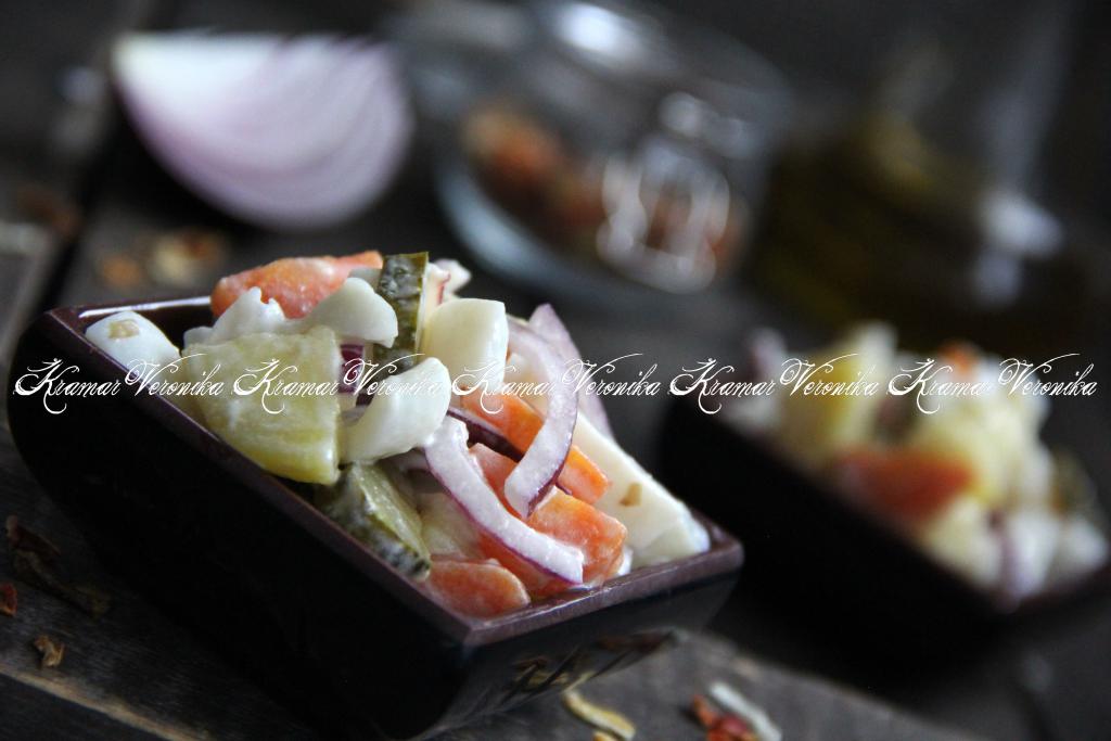 Морковь нарезать полукружочками. Чеснок очистить и пропустить через пресс. Соединить нарезанные кальмары, картофель, огурцы, морковь, лук, добавить чеснок.