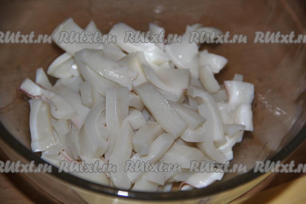 Нарезать кальмаров на полоски.
