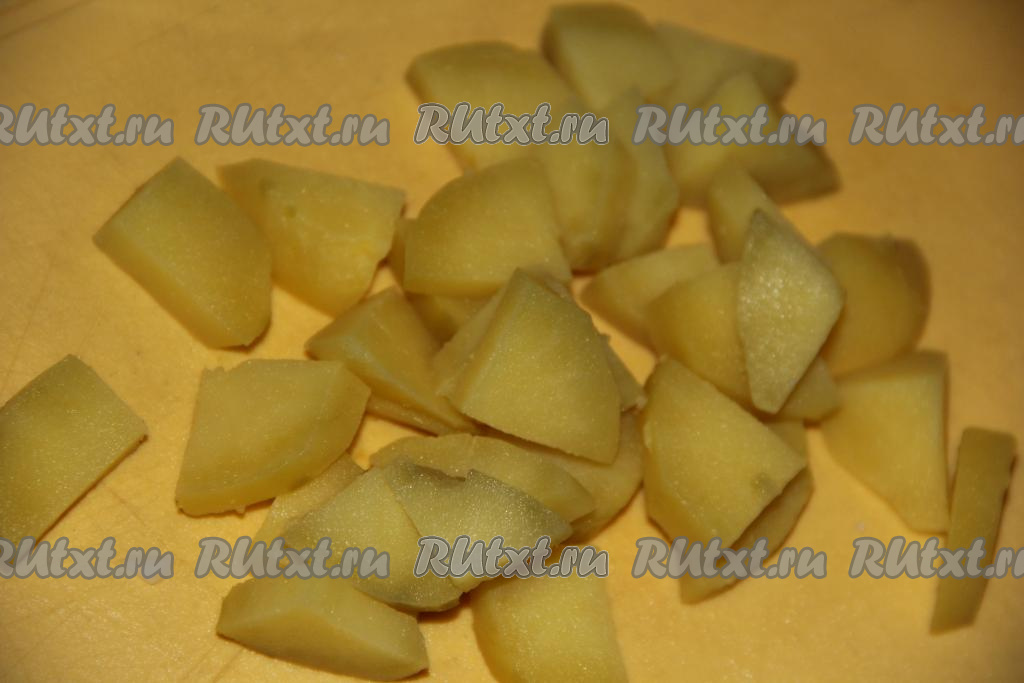 Картофель и морковь предварительно сварить, не очищая от кожуры, затем остудить и очистить. Нарезать картошины на кубики среднего размера.