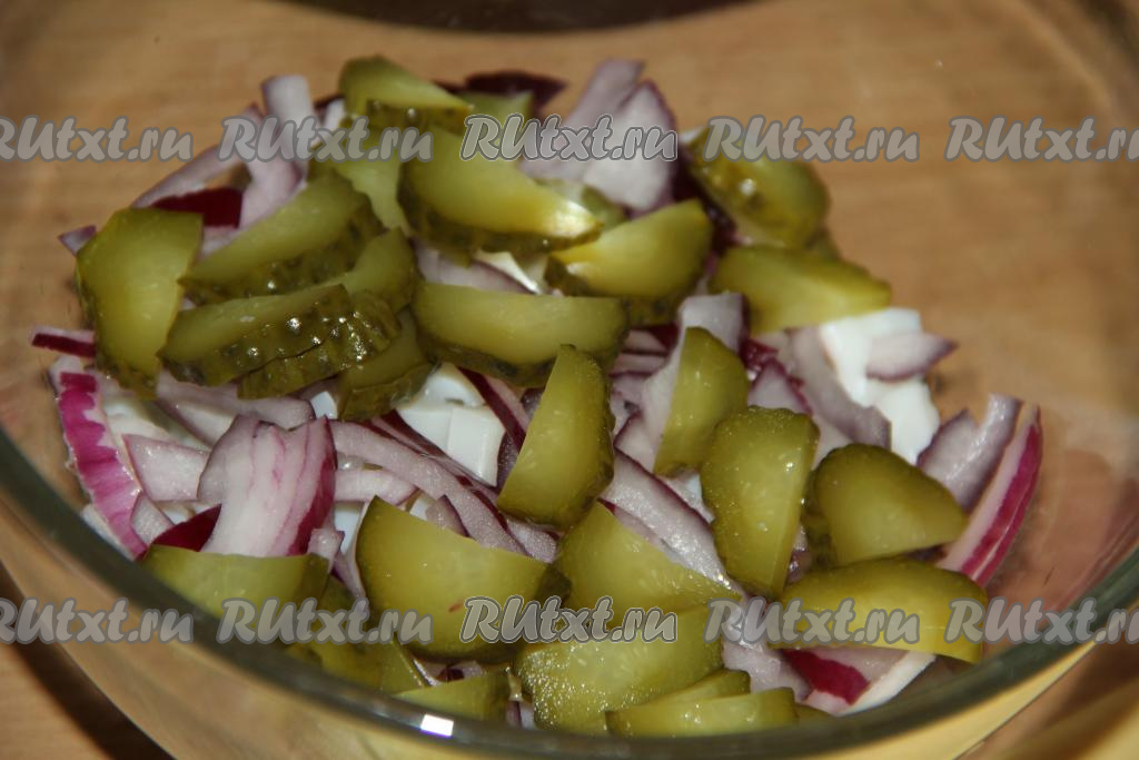 Солёные огурчики нарезать полукружочками (или кружочками).