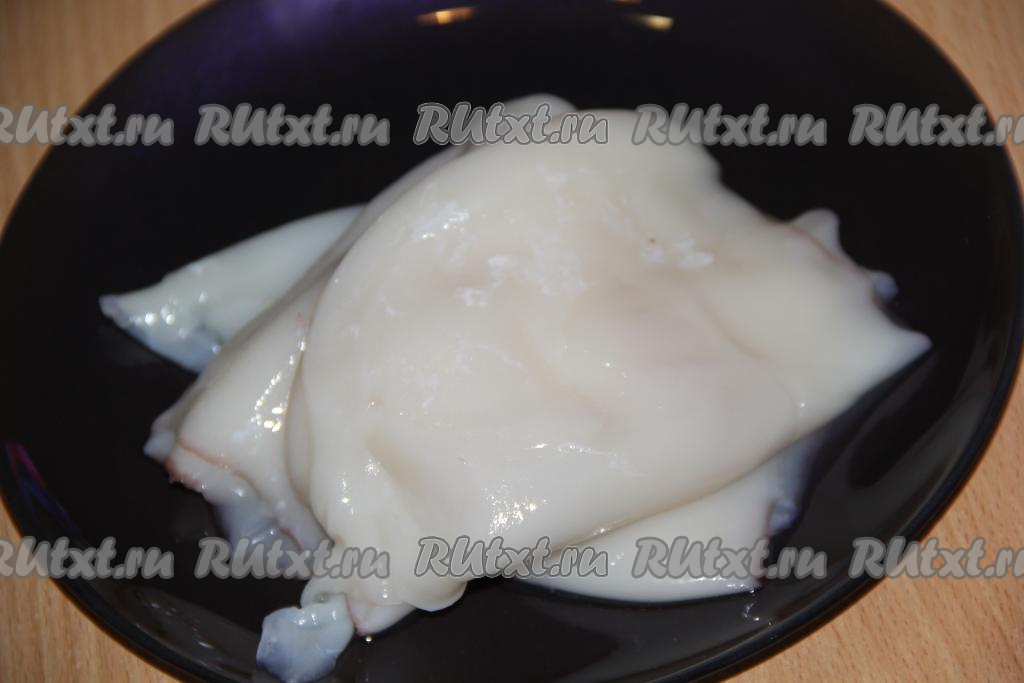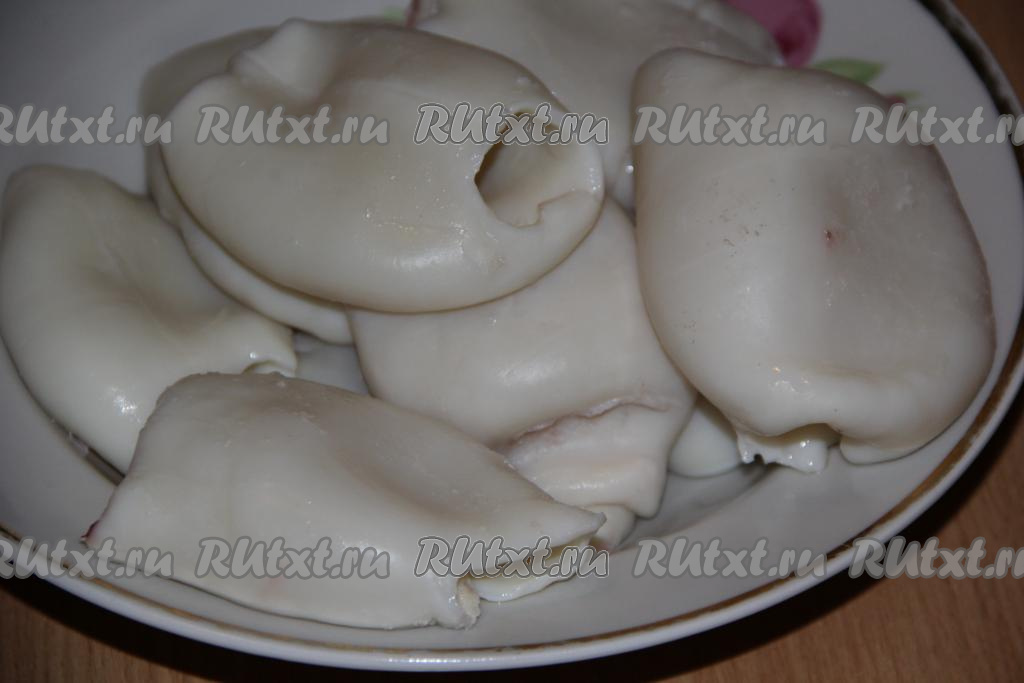 Кальмары предварительно разморозить при комнатной температуре. Промыть под водой. Я купила очищенные кальмары. Неочищенные кальмары нужно очистить от тёмной плёнки, а затем удалить хорду из каждой тушки.