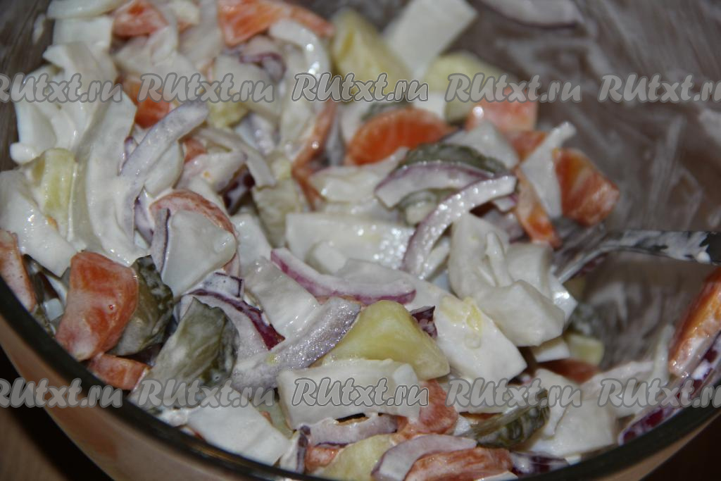 Посолить салат по вкусу и заправить майонезом.