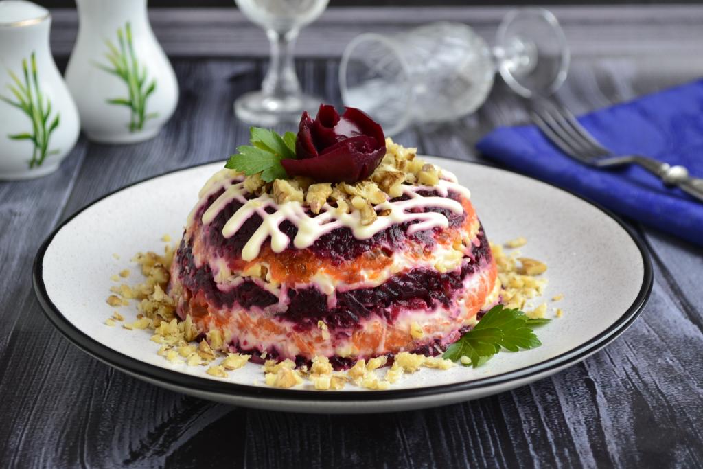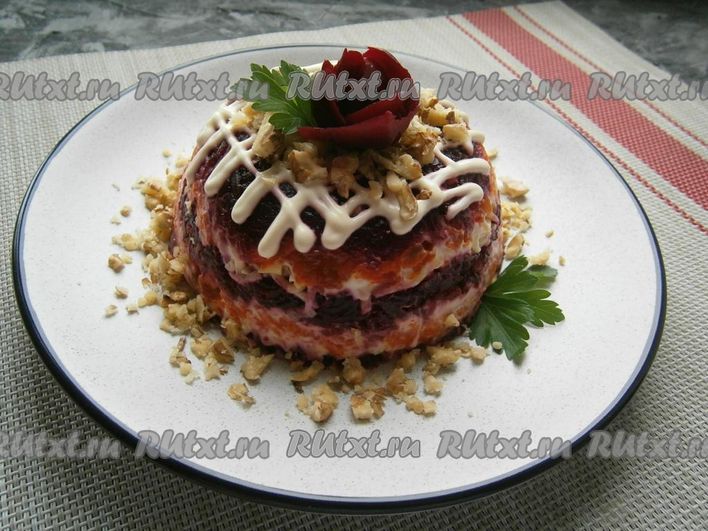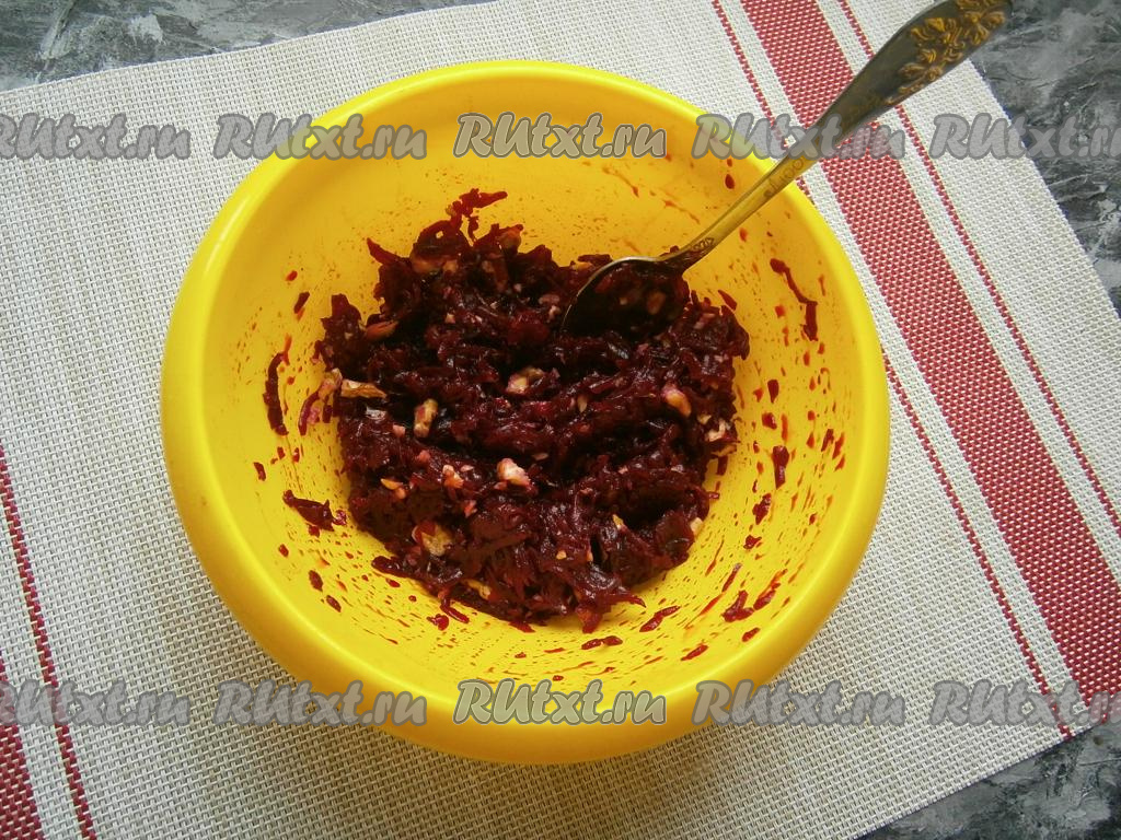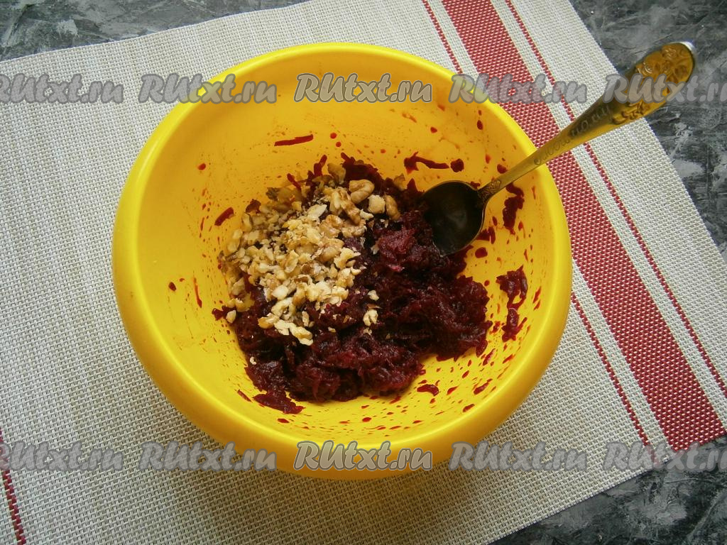 Предварительно отварить в кожуре свеклу и морковь. Свекла варится около 45-60 минут с момента закипания воды, морковь - минут 20-25. Овощи остудить и очистить. Свеклу натереть на средней тёрке, отжать от жидкости. К натёртой свекле добавить горсть мелко нарубленных грецких орехов.