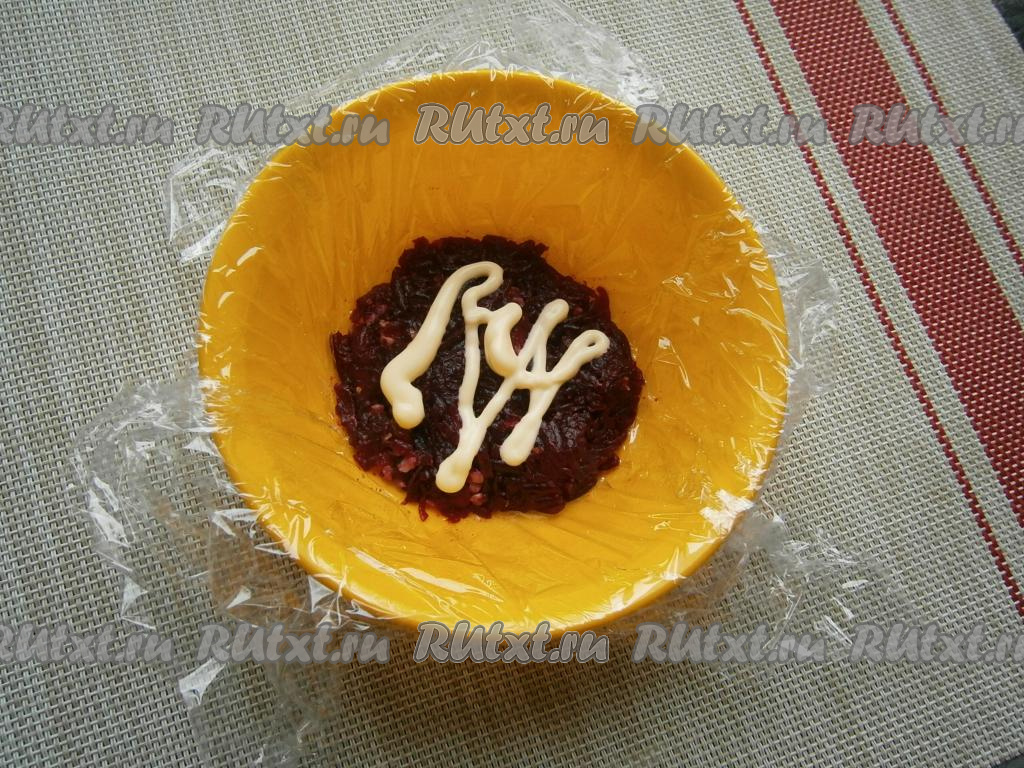 Небольшую глубокую мисочку или салатник (у меня диаметром 12 см) застелить пищевой плёнкой. Выложить 1/3 часть свеклы с орехами, утрамбовать, смазать майонезом.