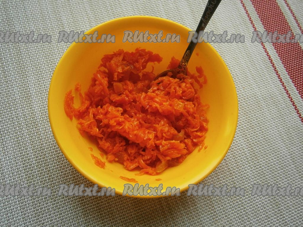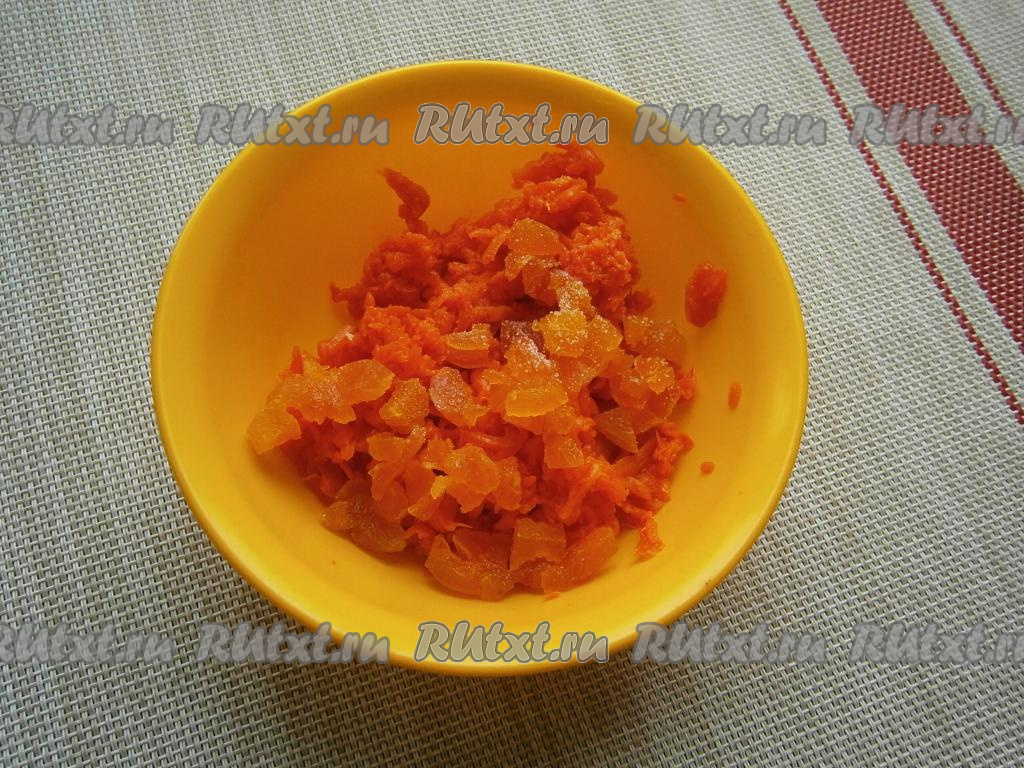 Варёную морковь тоже натереть на средней тёрке, добавить мелко нарезанную курагу (или изюм), посолить. Курагу нужно предварительно промыть горячей водой и обсушить, изюм можно залить кипятком на 10-15 минут, а потом обсушить.