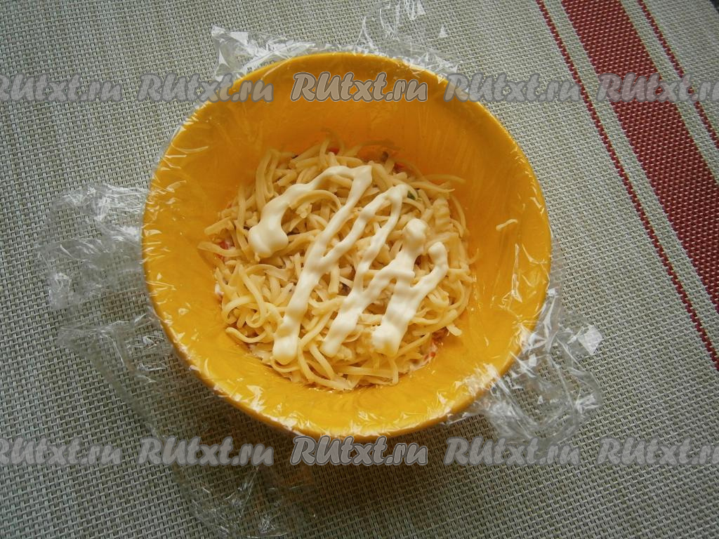 Далее выложить половину сыра с чесноком, нанести майонез.