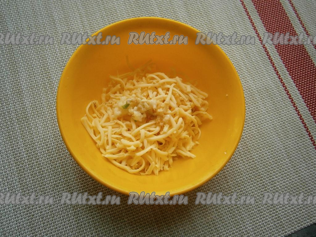 Сыр натереть на средней (или мелкой) тёрке, добавить пропущенный через пресс чеснок, перемешать.