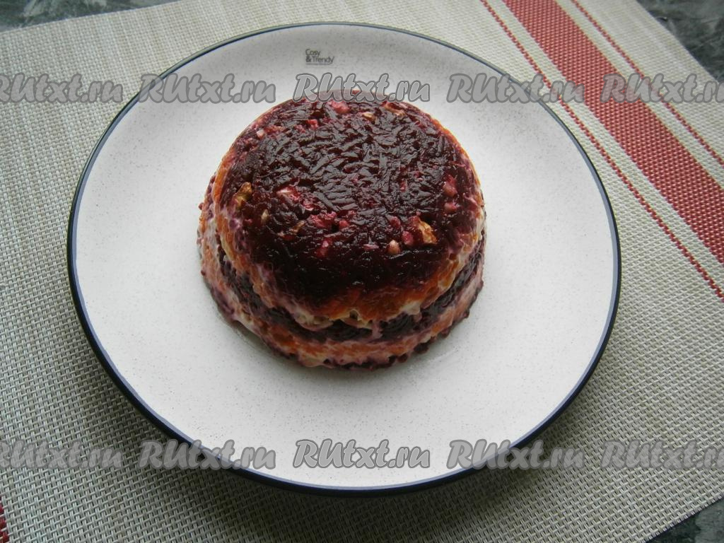 Затем слои повторить, хорошо их утрамбовывая, то есть выложить 1/3 часть свеклы с орехами, смазать майонезом, затем выложить оставшуюся морковь с курагой, смазать майонезом, равномерно распределить оставшуюся смесь сыра с чесноком, смазать майонезом. Последним слоем выложить треть свеклы с орехами, майонезом смазать, но немножко.