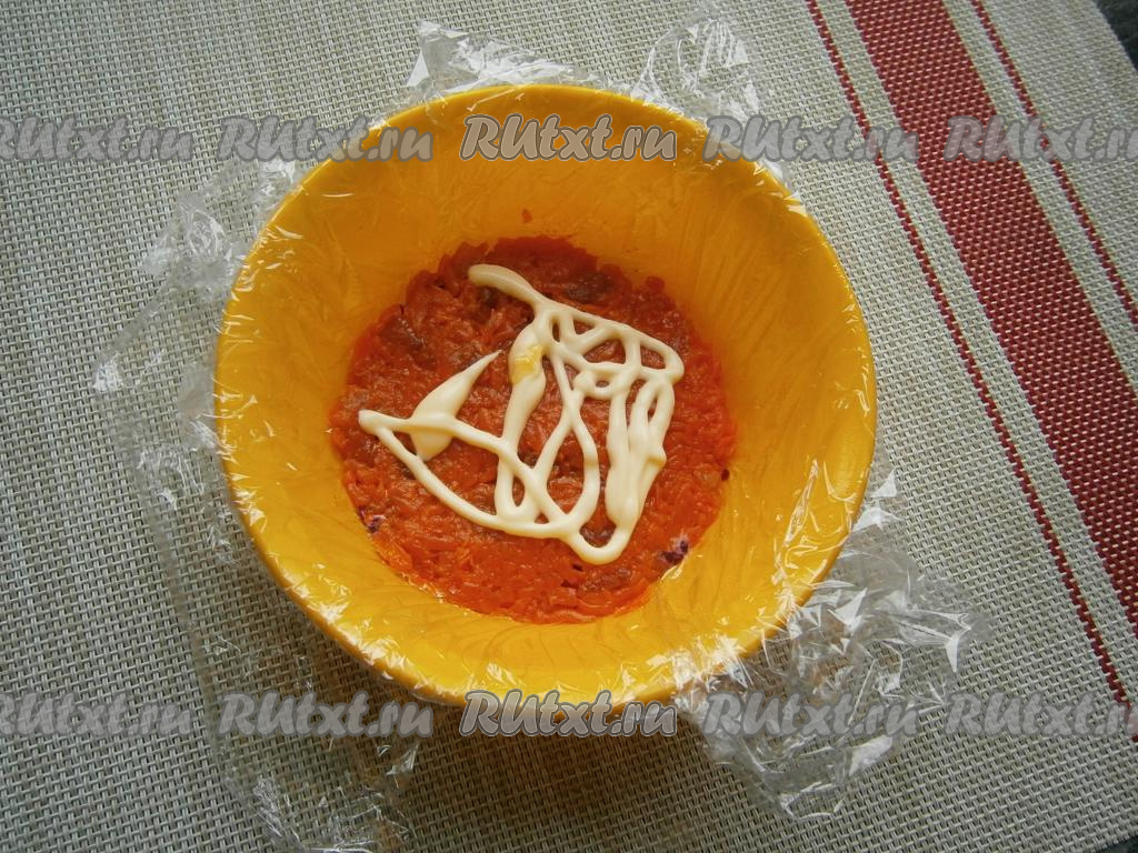 Следующим слоем выложить половину моркови с курагой, утрамбовать, смазать майонезом.