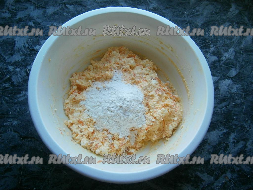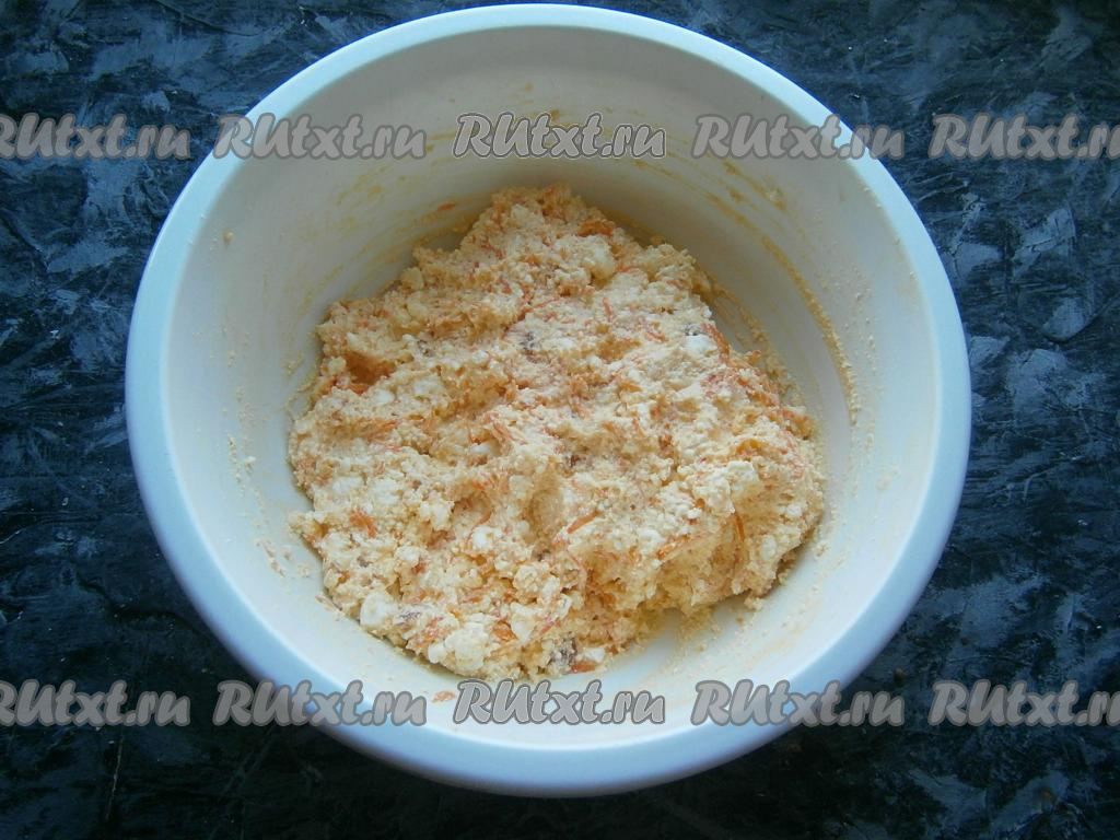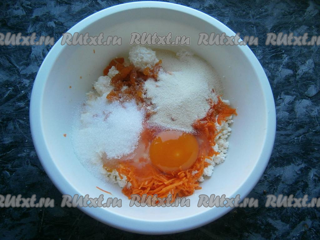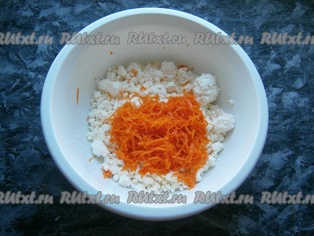 130 грамм мякоти тыквы, предварительно очищенной от кожуры и семян, натереть на средней (или мелкой) тёрке и добавить в творог.