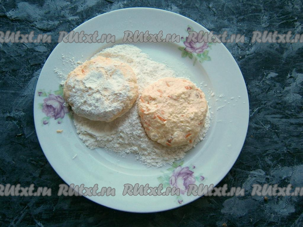 Тщательно перемешать и влажными руками сформировать средней величины лепёшки (заготовки сырников). На отдельную тарелку насыпать 3 столовые ложки муки, обвалять лепёшки со всех сторон в муке.