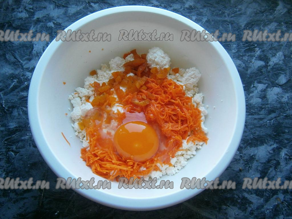 Сюда же вбить крупное сырое яйцо и мелко нарезанную курагу. Курагу нужно предварительно вымыть горячей водой и обсушить. Если нет кураги, то можно заменить её на изюм (изюм нужно предварительно залить на 10-15 минут кипятком, а затем обсушить), можно и вовсе не добавлять сухофрукты.
