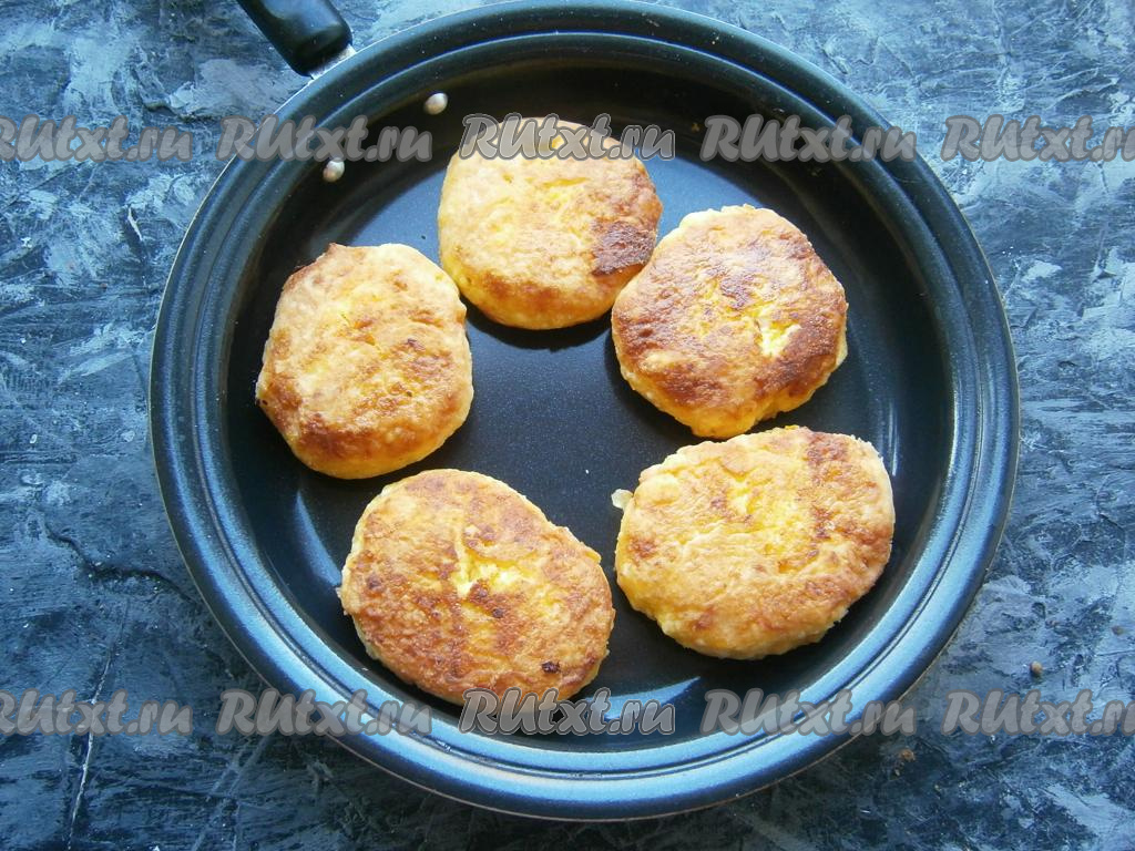 Жарить творожно-тыквенные сырники на разогретой с растительным маслом сковороде до румяности с двух сторон на среднем огне.