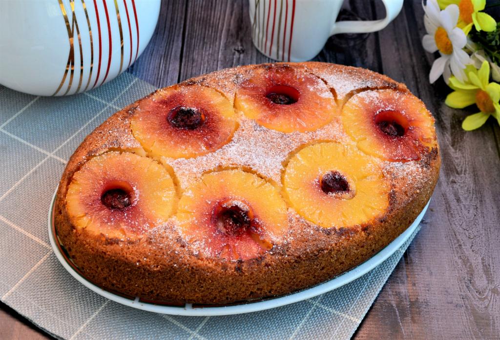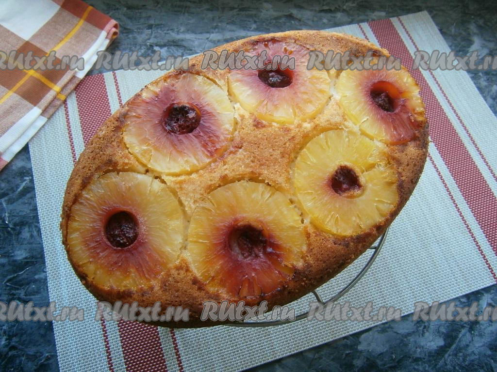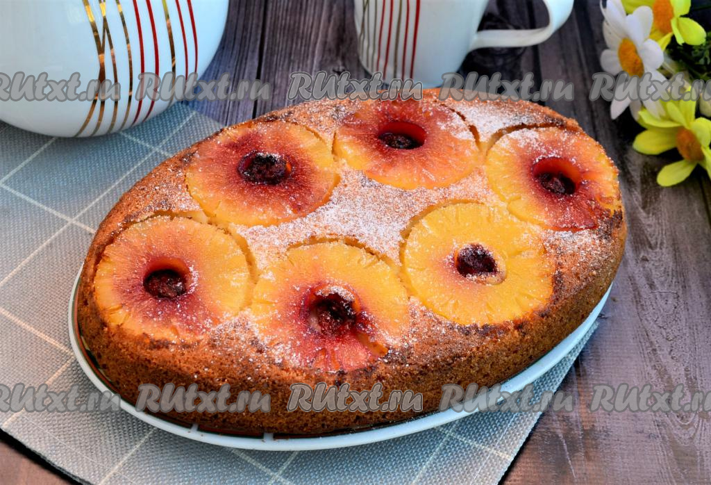 Вкуснейший, невероятно ароматный и красивый пирог-перевёртыш, приготовленный с консервированными ананасами в духовке, подать к столу.