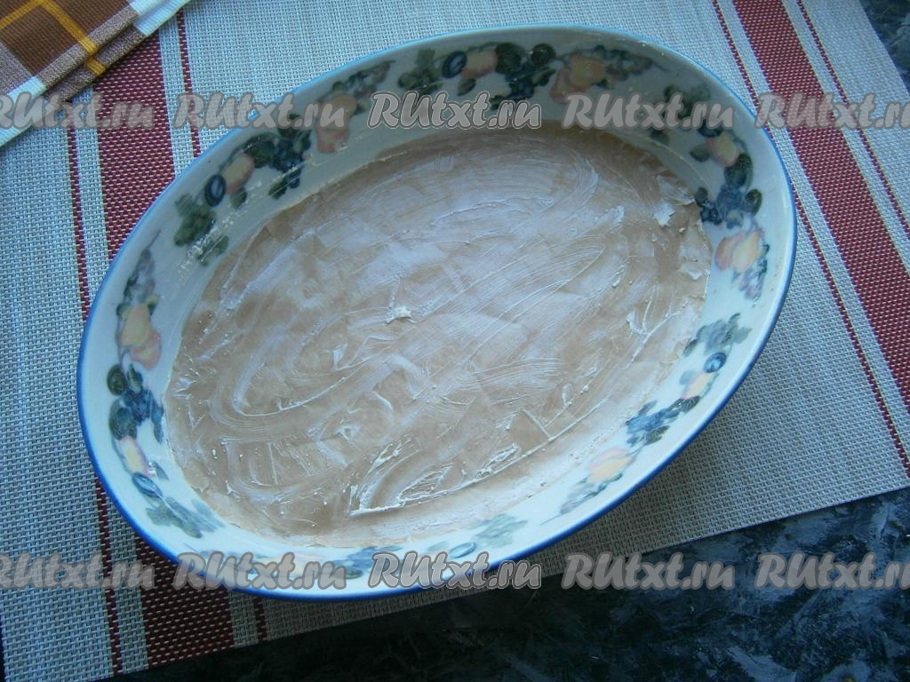 Дно формы (у меня овальная форма размером 27х18 см) застелить пергаментом. Бока и дно формы смазать сливочным маслом.