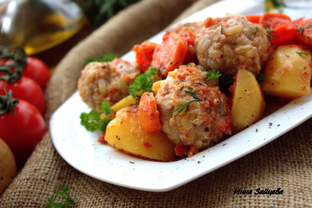 Предлагаю приготовить сытное, яркое, вкусное блюдо - тефтели, запечённые с овощами в духовке. Рецепт достаточно простой - картошка и овощи обжариваются до полуготовности, а затем запекаются вместе с тефтелями. В результате получается очень ароматное, аппетитное блюдо, к столу его нужно подавать в горячем виде со свежей зеленью. Такие тефтельки с овощами станут полноценным обедом или ужином для всей семьи, попробуйте!