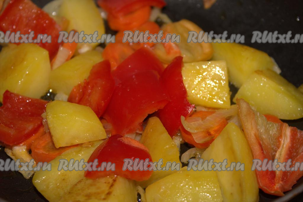 Удалить из болгарского перца плодоножку с семенами, а затем нарезать на кусочки среднего размера (не нужно нарезать мелко). Когда картофель и морковка с луком станут золотистого цвета, выложить к ним кусочки перца и обжарить на среднем огне 2-3 минуты, периодически помешивая.