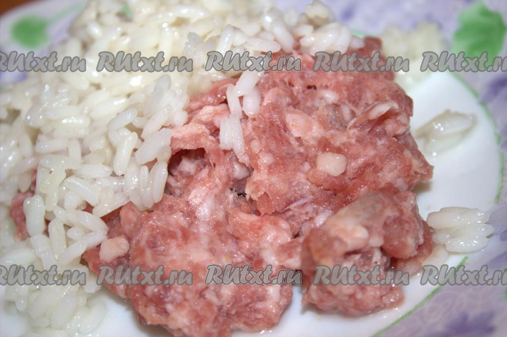 Промыть рис несколько раз под проточной водой, сливая воду. Затем в кастрюлю с промытым рисом влить 200 мл холодной воды, поставить на огонь, довести воду до кипения, затем уменьшить огонь до минимума и варить рис, слегка посолив, на медленном огне 10-15 минут, прикрыв крышкой (до полного испарения воды). Откинуть готовый рис на дуршлаг и дать полностью воде стечь. В миске соединить мясной фарш и рис, слегка посолить и приправить специями по вкусу.