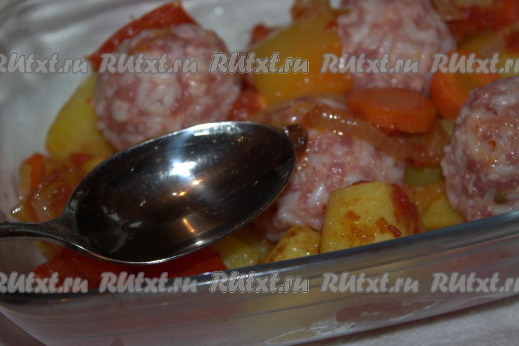 Жаропрочную форму с тефтелями и овощами накрыть фольгой (или крышкой), поставить в разогретую духовку и запекать 40-45 минут при температуре 180 градусов.