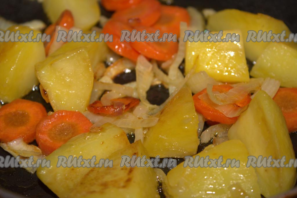В сковороде разогреть растительное масло, выложить нарезанные картофель, морковь и лук, обжарить овощи на среднем огне до лёгкого золотистого цвета (в течение минут 7-10), иногда перемешивая.