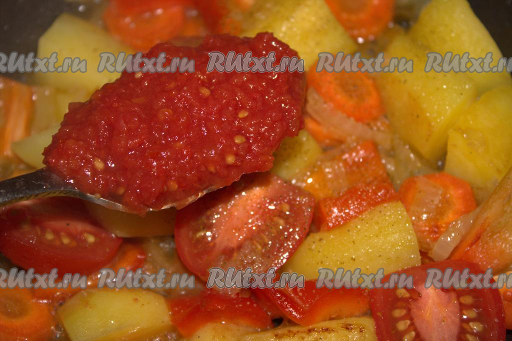 Далее в сковороду добавить томатную пасту (я добавила протёртые помидоры), тщательно перемешать, если нужно, посолить и снять сковороду с огня.