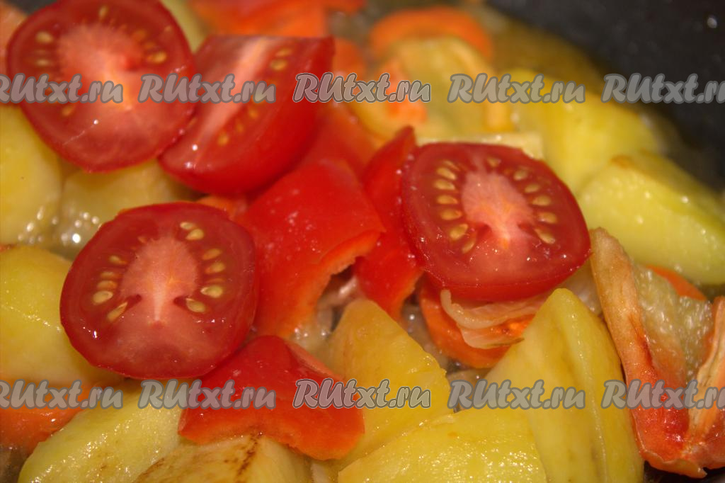 В сковороду к овощам выложить помидоры черри, разрезанные пополам (если используете обычный помидор, тогда нарежьте его на крупные кусочки), перемешать и обжаривать 1-2 минуты.
