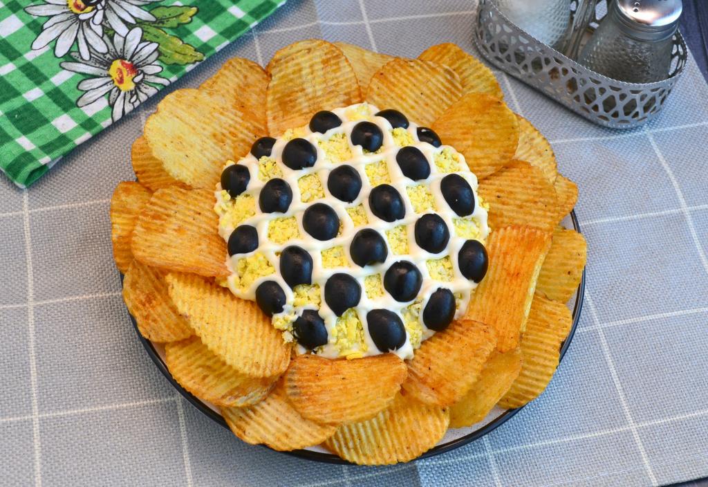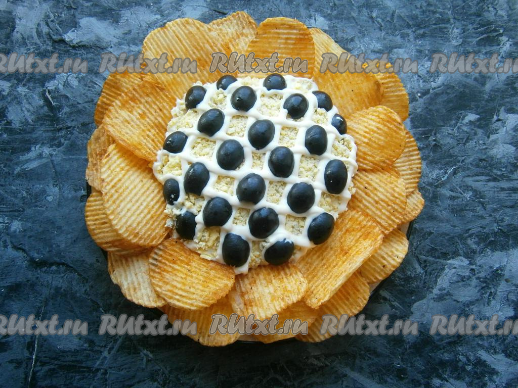Украсить салат по кругу целыми чипсами, имитируя лепестки подсолнуха. Можете сделать лепестки в один ряд, можете - в два или три ряда. Чипсы, конечно, лучше выбирать ровненькие, одинакового размера.