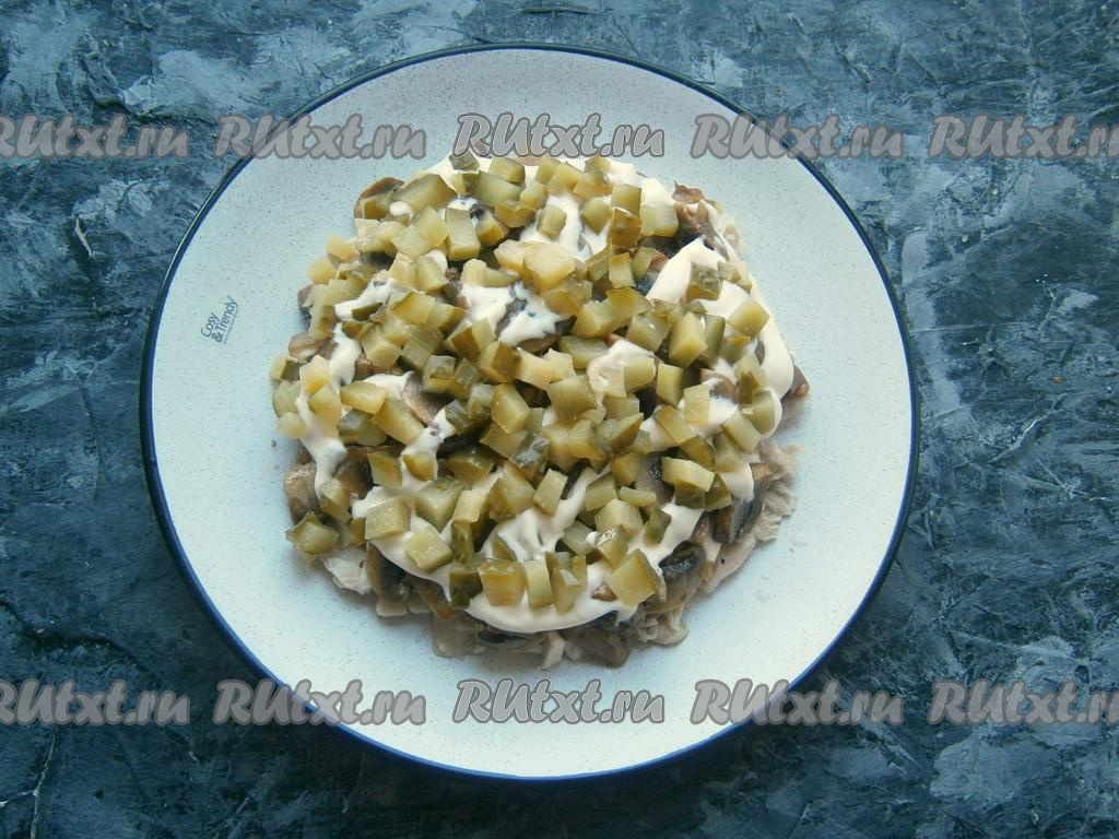 Смазать этот слой майонезом и выложить следующим слоем нарезанный маленькими кубиками маринованный огурчик.