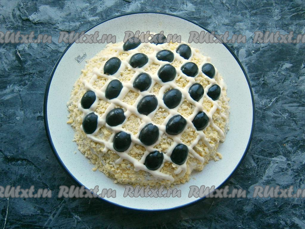 В ячейки сетки из майонеза, через одну, разместить половинки чёрных оливок, имитируя семечки. Оливки нужно выкладывать в ячейки из майонеза в шахматном порядке (как на фото).