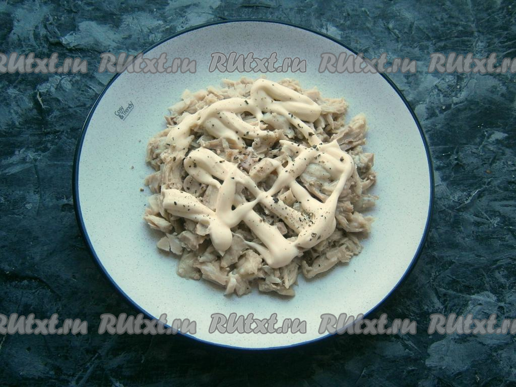 На круглую плоскую тарелку выложить нарезанное мясо курицы первым слоем, немного посолить, нанести сеточку из майонеза, поперчить.