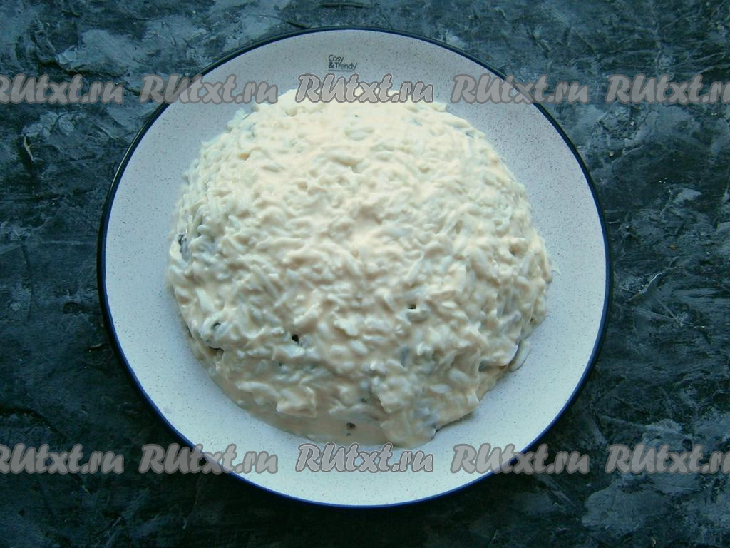 Яйца, предварительно отваренные в течение минут 10 с момента начала кипения воды, остудить, очистить, разделить на желтки и белки. Натереть белки на средней (или мелкой) тёрке и выложить на огурцы, покрывая салат и сверху, и с боков, придавая блюду форму полушара. Смазать майонезом.