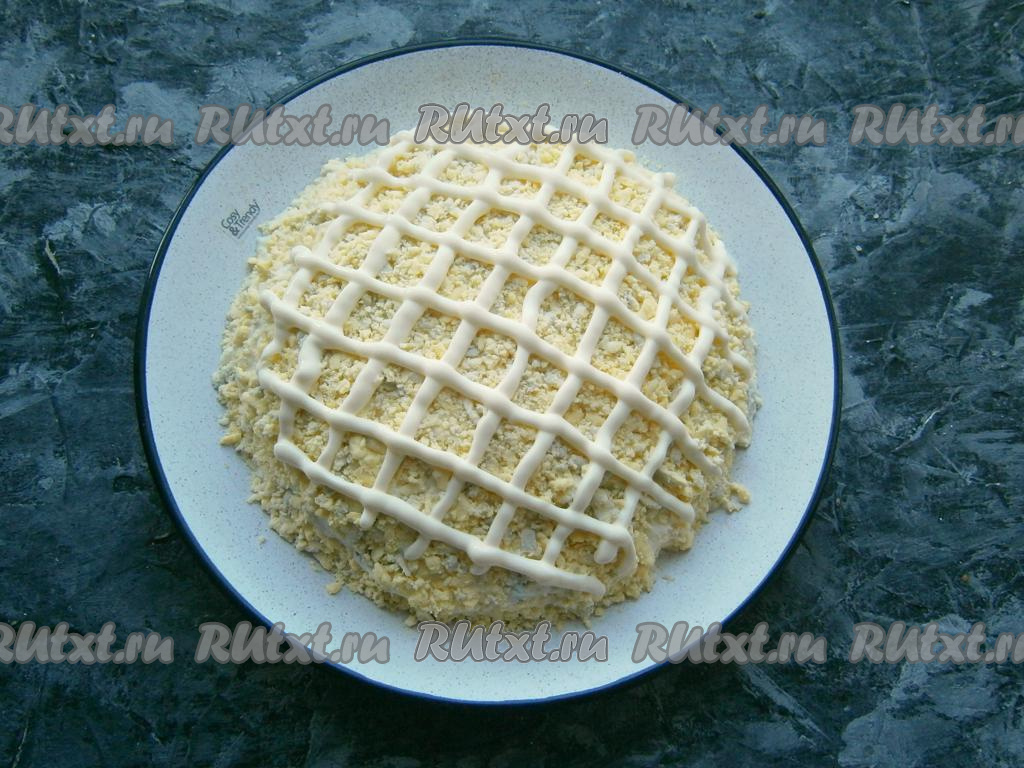С помощью кулинарного одноразового мешка с чуть обрезанным кончиком нанести сверху салата ровную сетку из майонеза.