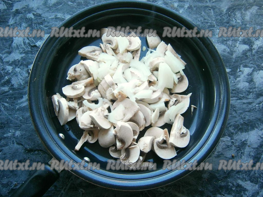 Куриное мясо предварительно отварить в течение 35-40 минут с момента закипания подсоленной воды, затем остудить. Шампиньоны вымыть, обсушить, нарезать пластинами, поместить в сковороду вместе с очищенным и нарезанным тонкими перьями репчатым луком, влить растительное масло.