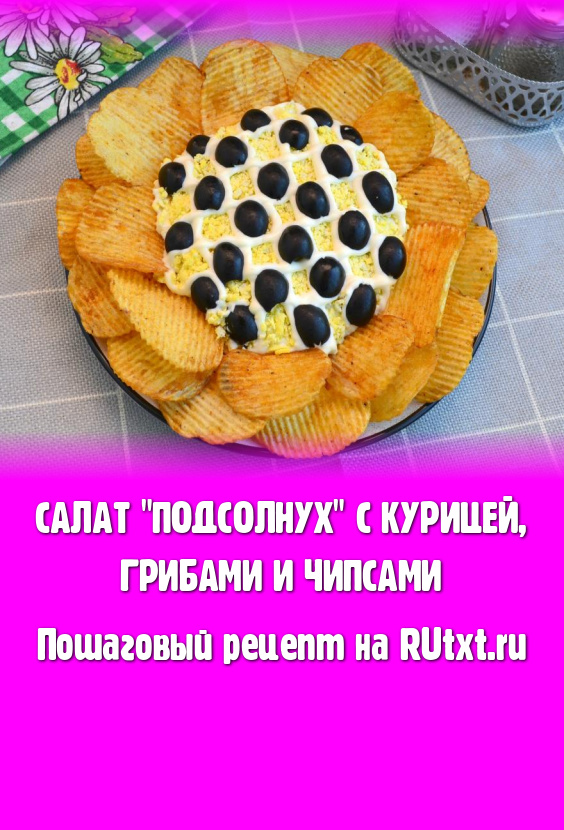 Очень вкусный, красивый салат "Подсолнух", приготовленный с грибами, курицей и чипсами, можно подавать к столу. Такое эффектное блюдо не останется незамеченным на праздничном столе!