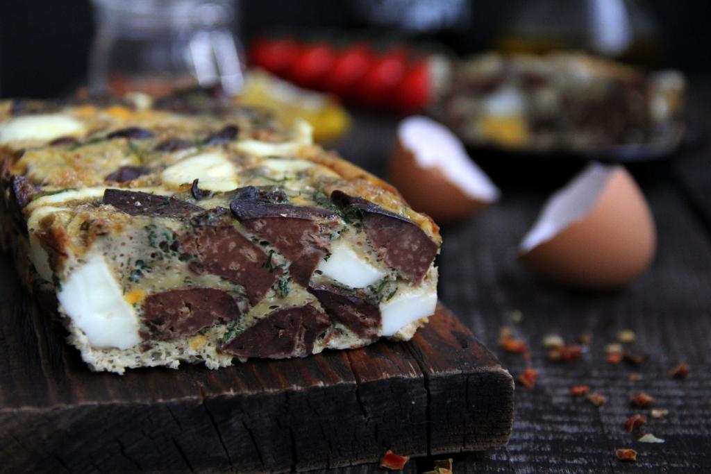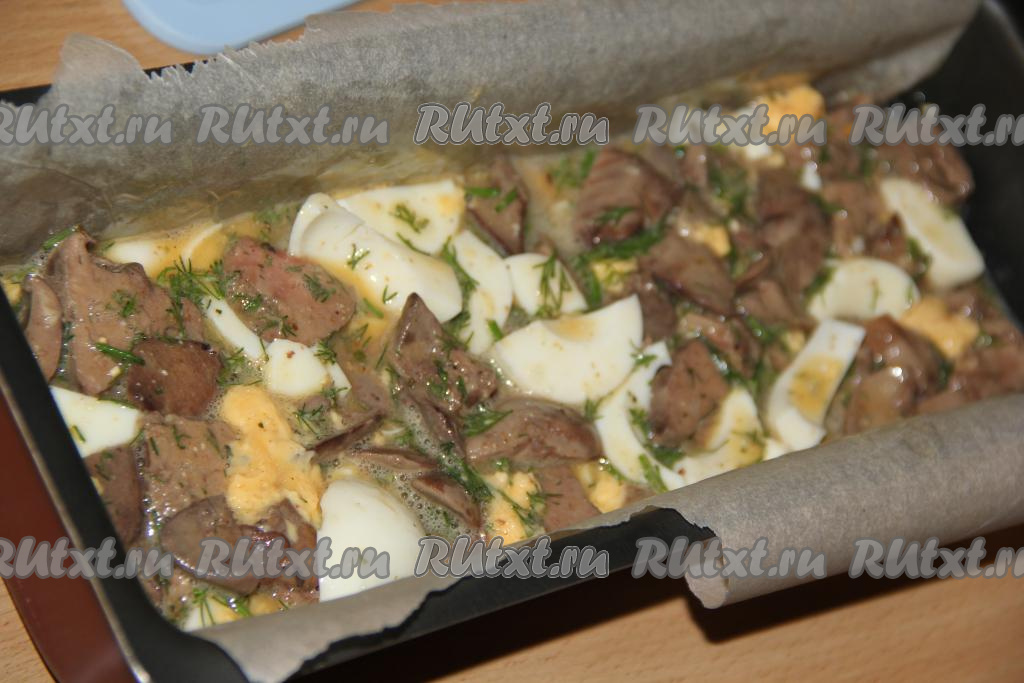 Форму для запекания (я использовала прямоугольную форму для хлеба) застелить пергаментом, смазать пергамент маслом. Выложить массу из куриной печени и яиц в форму, разровнять и отправить в разогретую духовку, запекать минут 40 при температуре 200 градусов. На поверхности не должны остаться сырые яйца.