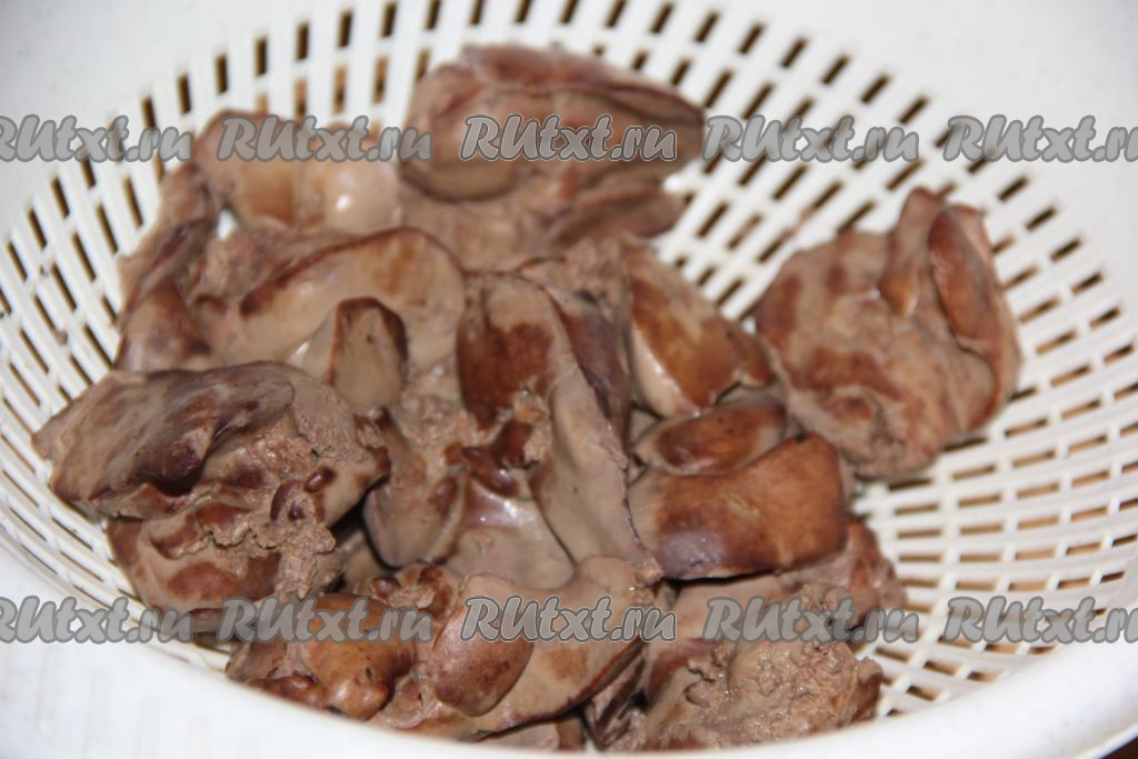 Откинуть варёную куриную печень на дуршлаг и дать стечь воде.