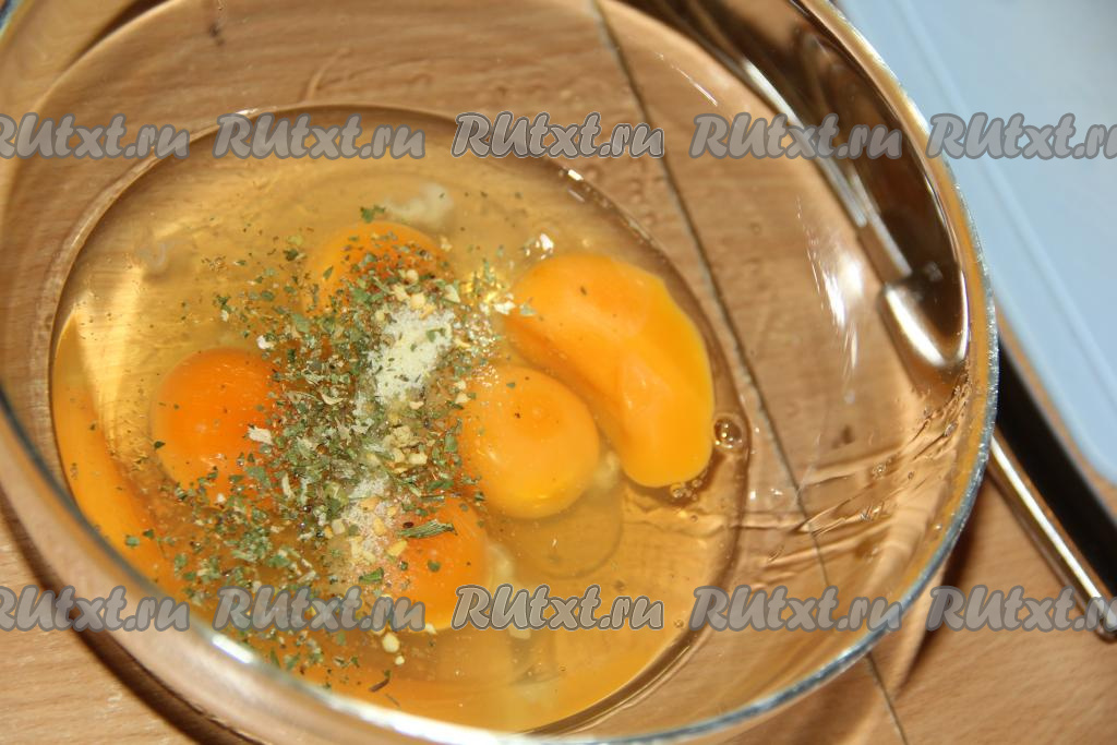 В отдельной миске соединить сырые яйца, добавить немного соли и специй.