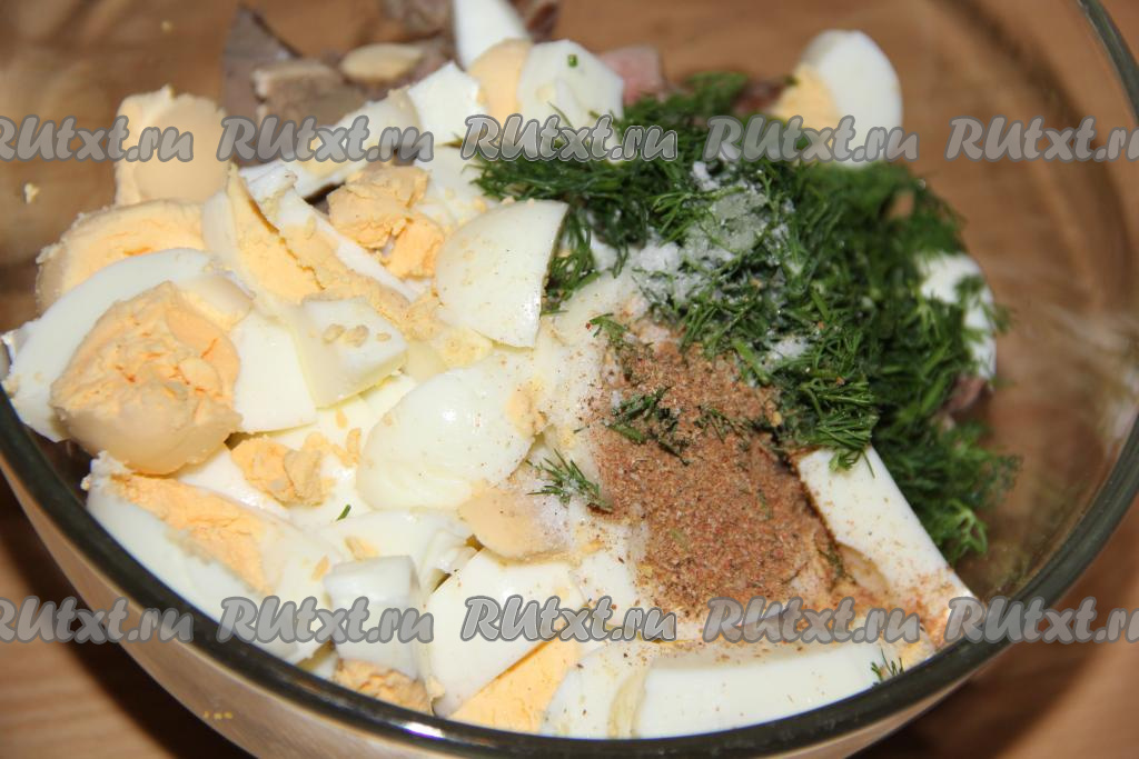 4 яйца, предварительно отваренные в течение минут 10 с момента начала кипения воды, нужно очистить и крупно нарезать. Добавить яйца к печени. Укроп мелко нарезать и добавить к кусочкам печени и яиц, всыпать соль и специи.