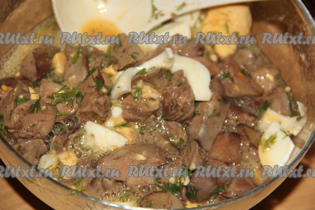 Влить яичную массу к печени, варёным яйцам и укропу, перемешать.