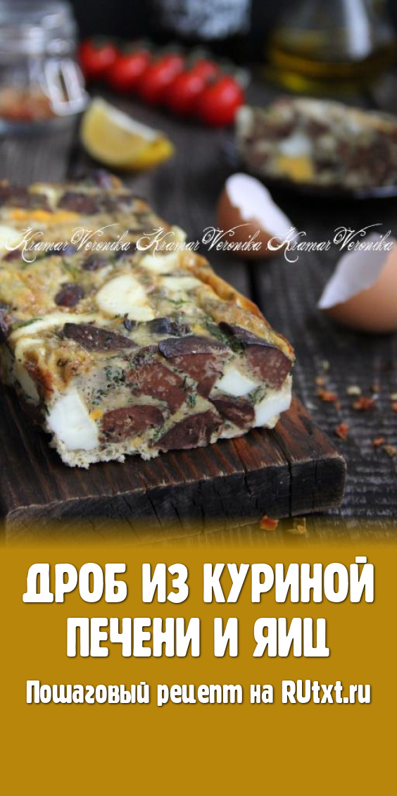 Дроб - это блюдо румынской кухни, которое готовят из субпродуктов. Рецептов существует много, вот один из них: дроб из куриной печени и яиц. Блюдо напоминает запеканку и получается сытным, вкусным и очень нежным. В разрезе дроб выглядит очень красиво. Нарезав на кусочки, его можно подать с гарниром. Мне же понравилось класть кусочек дроба на хлеб и кушать вприкуску с чаем.