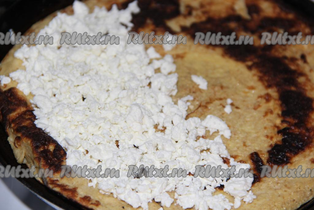 Пока выпекается вторая сторона, выложить творог на 1/2 блина (как на фото). Я использовала зерновой творог жирностью 5%.