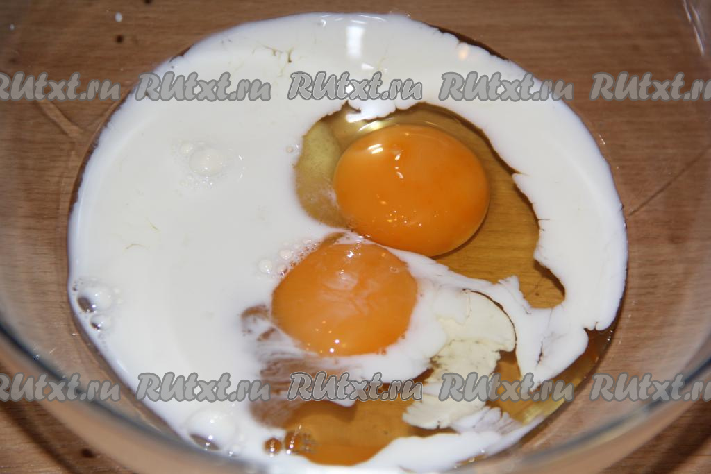 В миску вбить яйца и добавить молоко.